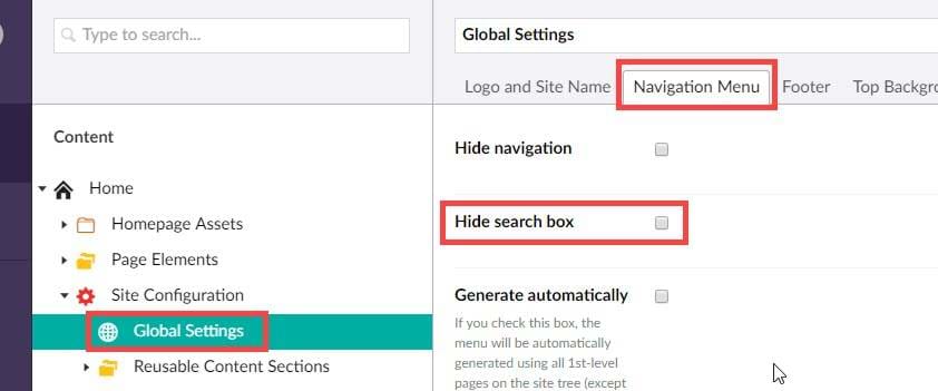 We recognise that a 'Site Search' tool is not necessary for every site though, especially those that are single page scrollers or just a couple of pages in size. So if you don't want the little magnifying glass displayed in your navigation bar, have no fear, as we've made this feature something that you can easily toggle on and off via the CMS. To do so, simply log into the CMS and then go to: Site Configuration > Global Settings > Navigation Menu and then check or uncheck the "Hide search box" field as required. See below: